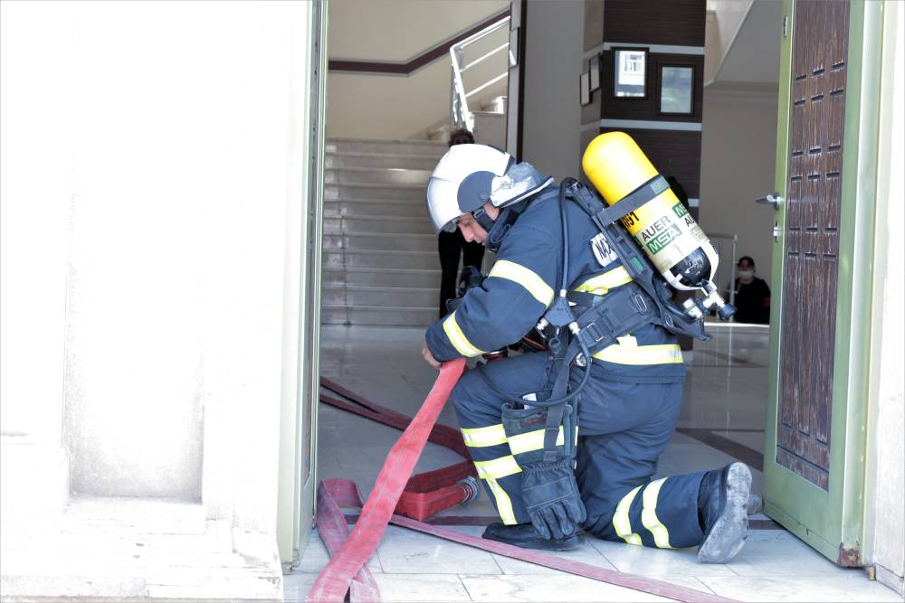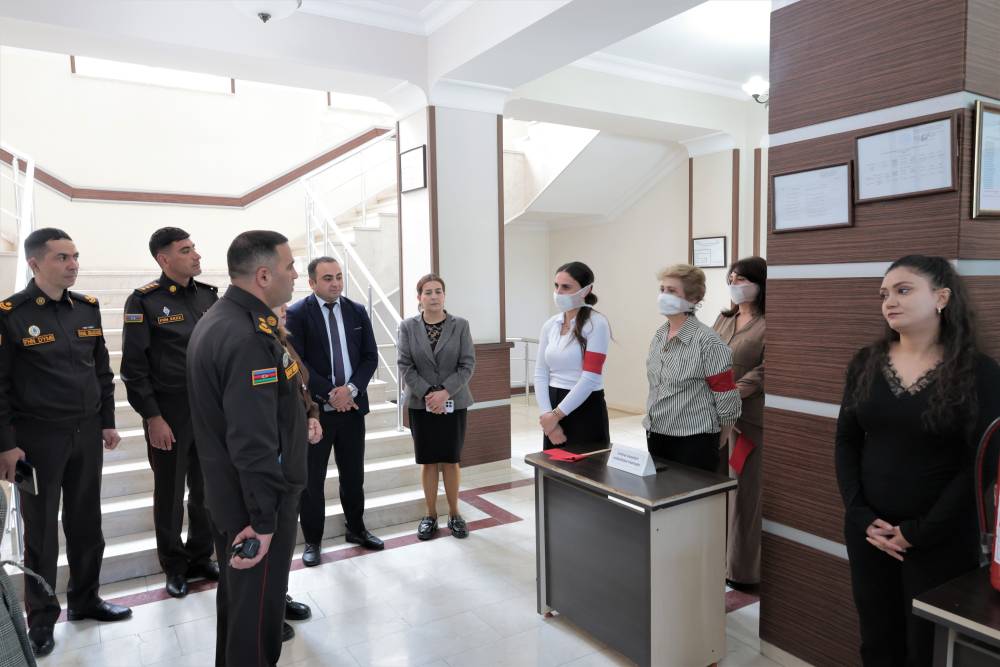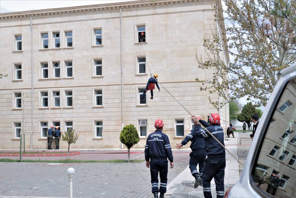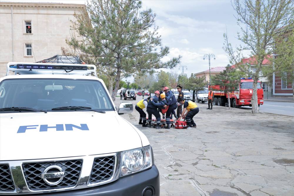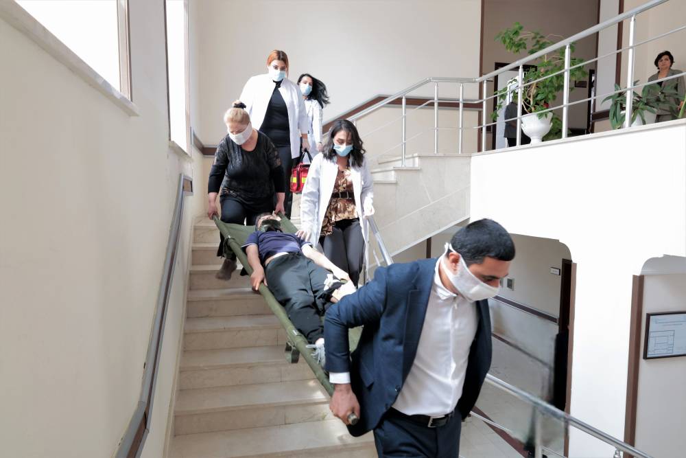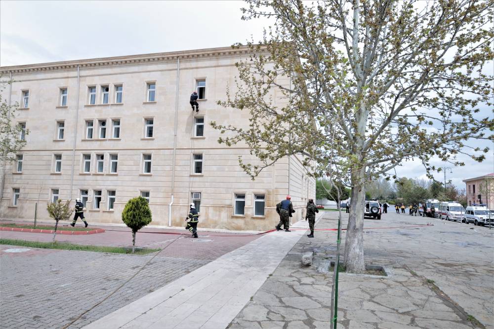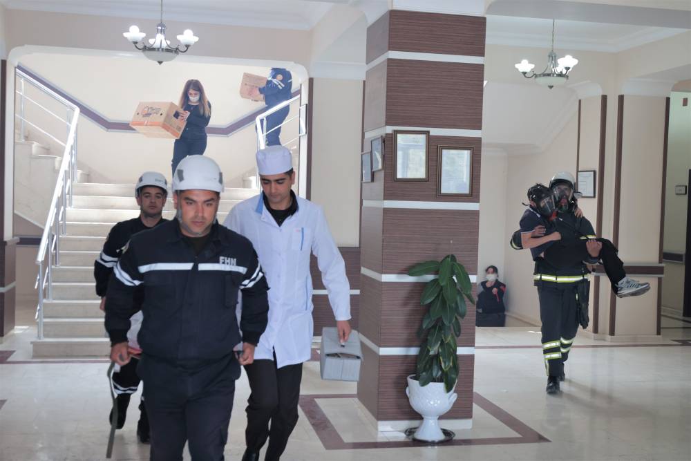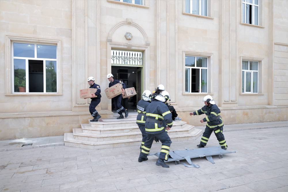 Sonra məşqin praktiki hissəsinə start verilib. Belə ki, şərti zəlzələ və yanğın zamanı “Həyəcan” siqnalı verildikdən sonra FHN-in yanğın-xilasetmə bölmələri operativ qaydada hadisə yerinə çataraq kitabxananın mülki müdafiə qüvvələri ilə əlaqəli şəkildə obyektin təxliyə planına uyğun insanların təhlükəsiz yerə təxliyəsini həyata keçiriblər.